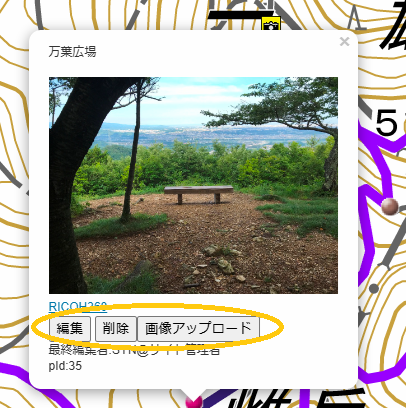 図形のプロパティは地物をクリックすると表示される「編集」「削除」「画像アップロード」ボタンから編集できます。それぞれ必要な画面に遷移するので入力してください。